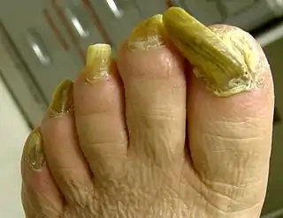 La onicogrifosis es el aumento exagerado del grosor de las uñas y éstas se acaban curvando en espiral.[1] Aunque es más frecuentemente en las uñas de los pies, afecta sobre todo a los grandes dedos de los pies o las manos.