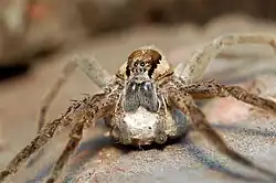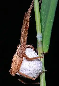 Pisaurina mira fotografiado con su ooteca en la noche.