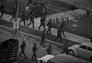 ![]() Elementos del Ejército Mexicano en las inmediaciones de la Plaza de las Tres Culturas, 1968. | ||||
