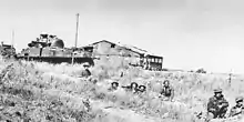 ![]() Cohetes disparados desde un Hawker Typhoon del Escuadrón No. 181 de la Royal Air Force, en su camino hacia edificios del aeródromo de Carpiquet. La 3.ª División Canadiense tomó Carpiquet, al oeste de Caen, el 4 de julio. | ||||