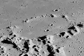 Esta formación consiste en poco más que un arco irregular de pequeñas elevaciones en el sur, y un anillo de crestas dispersas en el borde norte. Presenta una brecha particularmente amplia en el sector noreste del borde, donde no se han preservado crestas que marquen el perímetro del cráter. El suelo interior ha sido regenerado por la lava basáltica.