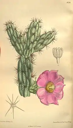 Es un arbusto arbolado carnoso con tallo cilíndrico armado de espinos, que puede alcanzar 3 m de altura con una forma arbórea. Tiene segmentos ramificados largos y cilíndricos, con tubérculos muy prominentes y espinas blanco pardusco de unos 25mm de longitud. De color verde y flores de color rosa o rojo.