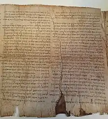 Mientras estaba en Jericó, Orígenes compró un antiguo manuscrito de la Biblia hebrea que había sido descubierto «en un frasco»,[58] un hallazgo que prefigura el descubrimiento posterior de los Rollos del Mar Muerto en el siglo XX.[58] Aquí se muestra una sección del rollo de Isaías de Qumrán.