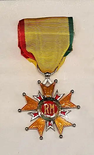 Se otorga en cinco grados. Los dos primeros consisten en una banda con una placa estrellada plateada que lleva una gran estrella naranja de cinco puntas ensanchadas y con los extremos hendidos por una escotadura, cruzándose con otra estrella de iguales característica pero roja y más pequeña. A su vez, en el centro de estas estrellas hay un círculo rojo con las letras «RM» y con un borde dorado que lleva grabados laureles y las palabras «ORDRE NATIONAL». El tercer grado lleva la medalla no montada en la placa plateada pero sí unida a su cinta (que se coloca en el cuello) por un león rodeado de laureles. El tercer y cuarto grado llevan sólo la medalla unida a la cinta, que es amarilla con estrechos bordes verde y rojo.[1]