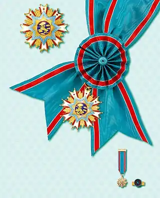 Es una recompensa civil habitualmente otorgada a extranjeros por un mérito civil notable, en el caso de la recompensa a nacionales, suele ser a funcionarios de alto rango que han tenido una larga trayectoria de contribuciones al país o han llegado a un gran nivel de autoridad. La cinta es azul claro, con rayado coloreado hacia cada borde.