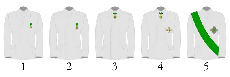 - CAVALIERI DI GRAN CROCE DECORATI DEL GRAN CORDONE (Caballero de la Gran Cruz con Gran Cordón) - con un máximo de 60 miembros. Luce la insignia de 67 mm de diámetro bajo una corona real suspendida de una cinta, así como la estrella de 8 puntas.