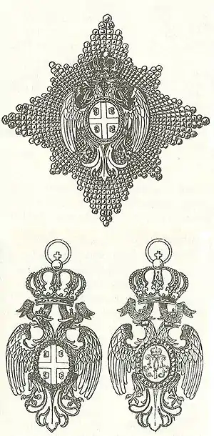 Orden del Santo Príncipe Lázaro como Orden Real... (1883-1898), Orden de Miloš el Grande (1898-1903), Orden de la Estrella de Karadjordje (después de 1903). | |