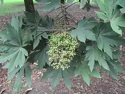 Alcanza la altura de 25 m. Su corteza es de color gris parduzco. Las hojas crecen horizontalmente, alternas, palmeadas, profundamente lobuladas (con 4 a 8 lóbulos), coriáceas, de textura acartonada; de 25 cm de longitud por 40 cm de ancho; con pecíolos conspicuos, dilatados en la base de color ferrugíneo en el envés y 45 cm de largo. Inflorescencia terminal en densas panículas de hasta 50 cm de largo. Flores sésiles con 5 pétalos amarillentos a blancos. Frutos globosos brillantes, de 5 a 8 mm de diámetro, rojos o morados al madurar. Semillas color marrón laro, alargadas, de 3,7 a 6 mm de largo y de 2 a 4 mm de ancho.[1][2][3]