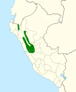 Se distribuye en los Andes del norte y centro de Perú (Cajamarca, Huánuco); registrado también en el extremo sur de Ecuador (sureste de Loja).[2]