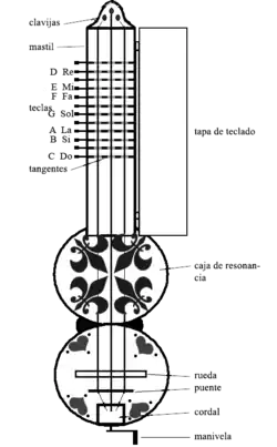 Sus elementos principales son: caja de resonancia, cuerdas, manivela, cordal, puente, rueda, teclado, clavijero, mástil y ceja.