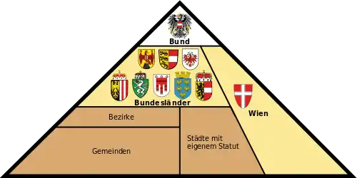 Austria es una República federal (en alemán: bund), y está dividida territorialmente en nueve Estados federados (en alemán: Bundesländer, en singular: Bundesland),[1] cada uno de ellos con su propio parlamento estatal (landtag), su gobierno estatal (landesregierung) y su gobernador o landeshauptmann / Landeshauptfrau. La capital, Viena, constituye un estado que abarca únicamente el propio municipio de Viena, donde ayuntamiento, concejales y alcalde hacen el papel de parlamento, gobierno y gobernador estatales. Los Estados federados están divididos administrativamente en distritos (en alemán: bezirke), sin poder político solo administrativo, que reúnen a los distintos municipios (en alemán: gemeinden) que forman el estado austriaco.[2]