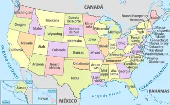 Estados Unidos de América es un país situado casi en su totalidad en América del Norte, al sur de Canadá y al norte de México. Posee también un estado insular (Hawái) y varios territorios en Oceanía y en el Caribe.
