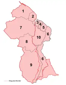 Las regiones 1, 2, 7, y la parte occidental de las regiones 3, 8 y 9 se encuentran ubicadas en el área de la Guayana Esequiba, la cual es reclamada por Venezuela. La región 7 incluye la parte oriental de isla de Anacoco, que Guyana disputa, pero que está bajo control de Venezuela desde 1966.