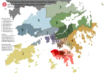La organización territorial de Hong Kong está conformada de un único nivel, en donde se ubican los 18 distritos (en chino tradicional, 香港地區). Cada distrito tiene un consejo de distrito, anteriormente juntas de distrito, para el cual los distritos se establecieron en 1982,[1] cuando Hong Kong estaba bajo el dominio británico, Sin embargo, los distritos tienen una relevancia limitada para la población, ya que pocos servicios públicos operan de acuerdo con los límites del distrito.[2]