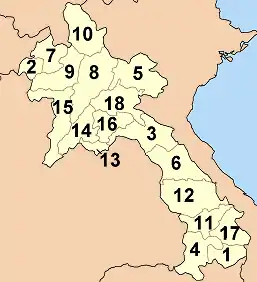 La República Democrática Popular Lao se divide en 16 provincias (kang), un municipio (nakon del kumpang) y una “zona especial” (khetphiset) hasta el 2006 (año en que fue disuelta). A su vez, las provincias y el municipio y la "zona especial" se dividen en distritos (muang) y aldeas (baan).