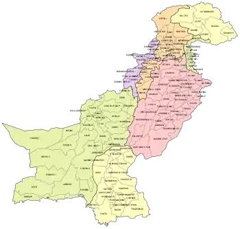 Pakistán es un estado federal, organizado en cinco provincias desde 2018 (Baluchistán, Jaiber Pastunjuá, Punyab, Sind y Gilgit-Baltistán), un territorio autónomo (Azad Cachemira) y un territorio federal (Islamabad). Cada provincia y territorio se subdivide en divisiones, que a su vez se subdividen en distritos, y estos en tehsils o taluka, que se fraccionan en consejos sindicales.[1]