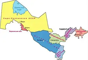 En 1925 se introdujeron las óblast en la República Socialista Soviética de Uzbekistán. Las óblast se dividieron en uyezd y éstos, a su vez, se dividieron en vólost. A partir del 1 de enero de 1926, la división administrativo-territorial de la República Socialista Soviética de Uzbekistán era la siguiente:[6]