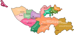 | Jorezm | Bagat, Gurlen, Koshkupyr, Urgench, Khazarasp, Hankin, Khiva, Shavat, Yangiarik, Yangibazar, ciudad de Urgench, ciudad de Gurlen, ciudad de Druzhba, ciudad de Khanka, ciudad de Khiva, ciudad de Shavat |