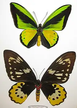 ![]() Ornithoptera goliath samson macho (arriba) y hembra (abajo). | ||