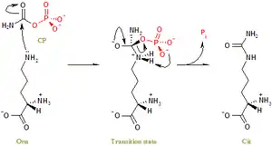 La ornitina transcarbamilasa cataliza la siguiente reacción en la que el carbamoil fosfato cede su grupo carbamoilo a la ornitina, para formar como productos la citrulina que se liberará en el citoplasma y un fosfato.