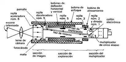 Ante el fotocátodo se sitúa la pantalla o mosaico de emisión secundaria, que es positiva respecto al fotocátodo y, por ello, atrae hacia sí los electrones emitidos por éste. Para que el desplazamiento sea en línea recta existen bobinas de enfoque que garantizan su no desviación. Los electrones pasan por una malla o rejilla y chocan contra la pantalla provocando, por el choque, la aparición de electrones secundarios que son atrapados por la malla. La emisión de estos electrones secundario deja sobre el cristal de la pantalla un conjunto de cargas positivas que dan información referente a la imagen captada por el objetivo y proyectada sobre el fotocátodo.