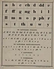 El impresor y editor Lewis Jones, uno de los cofundadores de Y Wladfa, el asentamiento de habla galesa en la Patagonia, favoreció una reforma de deletreo limitada en la que reemplazaba las letras galesas f y ff (/v/ y /f/, respectivamente) por las letras v y f, como en el inglés. Pero, de todas formas, el único vestigio real de esa práctica solo se mantiene en el nombre del asentamiento patagón Trevelin, que en la ortografía galesa estándar debería ser Trefelin.