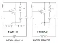 - Los osciladores LC son más sencillos, y modificando la capacitancia o la inductancia de alguno de sus componentes es posible obtener osciladores variables. Sin embargo, la construcción mecánica es delicada, y más allá de los 15 MHz son bastante inestables: la frecuencia "deriva". Algunos, como el Hartley, tienen un contenido de armónicos muy rico, lo que obliga a filtrar cuidadosamente la señal para eliminar esos armónicos. El Colpitts es sumamente utilizado. El Vackar es muy estable pero requiere en su versión original algunos componentes muy caros o difíciles de obtener. El Seiler y el Clapp son mejoras del Colpitts.