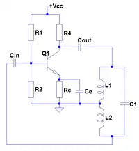 - Aunque puede tener distintas configuraciones, se distingue fácilmente por tener un divisor capacitivo en lugar de las bobinas. Generalmente, la unión de los capacitores tiene derivación a masa.