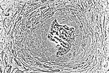 En este punto, el osteoide se mineraliza resultando en un nido formado por osteoide mineralizado que contiene osteocitos y está bordeada por los osteoblastos activos. El nido, que comenzó como un conjunto difuso de CMM, se ha convertido en tejido óseo rudimentario.[3]