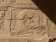 Una imagen del Templo de Dendera grabada en el siglo I a. C. nos indica que Osiris, al igual que los faraones humanos, tenía una titulatura real compuesta por cinco nombres y basada en un juego de palabras teológico[37]