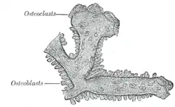 El osteoblasto no es precursor del osteoclasto; estos dependen del sistema fagocitomononuclear. Su función es hidrolizar la matriz, en el crecimiento óseo normal en los niños, en una quebradura y también para regular la concentración de calcio y fosfatos en sangre; por lo tanto, estas células tienen receptores para la parathormona y para la calcitonina, hormonas secretadas por paratiroides y tiroides respectivamente, antagonistas entre sí en el balance hidromineral. Los osteoclastos son células multinucleadas, tienen un borde en cepillo donde produce la fosfatasa ácida para degradar la matriz.
