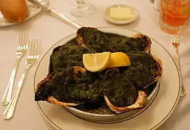 Las ostras Rockefeller consisten en ostras en su media concha cubiertas con una salsa de mantequilla, perejil y otras hierbas verdes, y pan rallado, y luego horneadas o asadas a la parrilla. La guarnición típica son gajos de limón.[1][2]