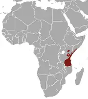 Esta especie se extiende desde el río Juba, en el sur de Somalia, hacia el sur a lo largo de la costa este de África hasta el río Ruvuma, en Tanzania, y de aquí a las tierras altas de Kenia. Su localidad más al sur es el extremo norte del Lago Malawi. También está presente en Zanzíbar, las islas Pemba y Mafia, Tanzania. Puede estar presente en Mozambique, pero no existen registros confirmados. Tampoco hay ninguna indicación de que la especie se encuentra en Malaui.[1]
