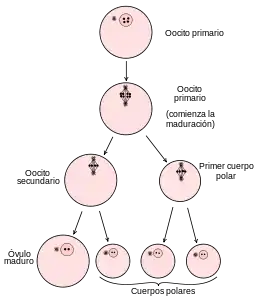 Durante la telofase, cuando los ovocitos primarios prosiguen con la meiosis, una de las células descendientes prácticamente no contiene citoplasma, mientras que la otra descendiente, tiene casi la totalidad de los constituyentes celulares. Esta primera célula se conoce como cuerpo polar y la otra como ovocito. Al entrar a la meiosis II dicho ovocito secundario, nuevamente tiene lugar una repartición del citoplasma desigual en la que la célula que recibe un poco más que un núcleo haploide formará otro cuerpo polar y la que recibe la mayor parte de los componentes citoplasmáticos formará el óvulo femenino ya maduro.