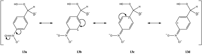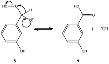 Los compuestos m-hidroxilados no se oxidan a m-bencenodioles ni carboxilatos. Por el contrario, forman ácidos fenilcarboxílicos. Las variaciones en las aptitudes migratorias de los anillos aromáticos pueden explicar esto. Los grupos hidroxilo en orto o para enlazados al carbonilo concentran la densidad de electrónica en el carbono aromático enlazado al carbonilo (10c, 11d). Los grupos fenilos poseen baja capacidad migratoria, pero una mayor densidad electrónica en el carbono incrementa la capacidad migratoria, facilitando la transposición [1,2] del arilo, permitiendo así que la reacción proceda. Los compuestos m-hidroxilados no concentran la densidad electrónica en el carbono que migra (12un, 12b, 12c, 12d) por lo que su capacidad migratoria permanece baja. El hidrógeno bencílico posee una capacidad migratoria más alta, por lo que emigra en lugar del arilo (8), formando así un ácido arilcarboxílico (9).