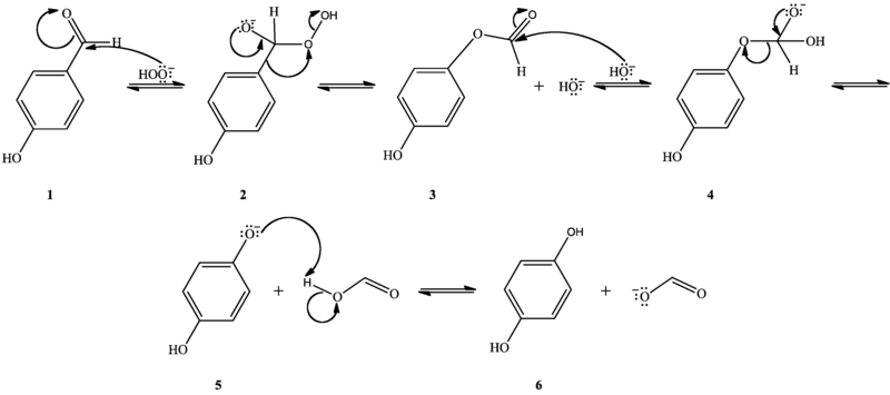 La oxidación de Dakin comienza con la adición nucleofílica de un anión hidroperóxido al carbonilo, formando un intermediario tetraédrico, (base conjugada del hidroperoxihemiacetal, 2). El intermediario transpone cuando el sustituyente arilo migra [1,2] desde el carbono peroxihemiacetálico al oxígeno del peróxido, causando así la eliminación de hidróxido, y la formación de éster tipo formato de arilo (3). El éster es hidrolizado por adición nucleofílica del hidróxido en disolución al carbonilo del éster, en el que se forma el intermediario tetraédrico (ortoformato monobásico de arilo, 4), el cual elimina un fenóxido y la el ácido carboxílico (5). Finalmente, el fenóxido desprotona al ácido carboxílico, formando el fenol y el anión carboxilato (6).
