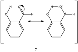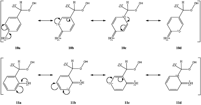 Los o-hidroxifenil aldehídos y las cetonas se oxidan más rápido que los p-hidroxifenilaldehídos y cetonas en condiciones débilmente básicas. En los compuestos o-hidroxilados, cuando el grupo hidroxilo se encuentra protonado, se puede formar un enlace de hidrógeno intramolecular entre el hidrógeno del hidroxilo y el oxígeno del carbonilo, estabilizando una estructura de resonancia con carga positiva en el carbono del carbonilo, aumentando así la electrofilicidad del carbonilo (7). Al carecer de esta estabilización, el carbono carbonílico de los compuestos p-hidroxilados son menos electrofílicos. Por lo tanto, los compuestos o-hidroxilados se oxidan más rápido que los compuestos p-hidroxilados cuando el grupo hidroxilo está protonado.