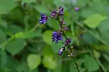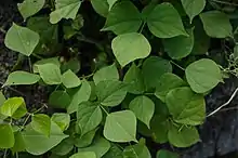 Enredadera, puede crecer hasta 7 m de longitud, hojas pinnadas trifoliadas de 12-28 cm de largo, folíolos anchamente ovoides a rómbicos de 6-12 cm de largo.
