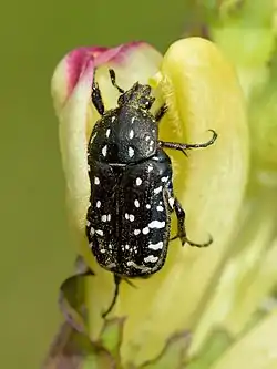 Es un insecto fitófago que presenta generalmente irisaciones de color cobre y manchas blancas muy irregulares. Es muy abundante sobre flores de muchos tipos; con frecuencia destruye las yemas florales de las vides y los árboles frutales. La larva se alimenta de raíces. Al volar hace un ruido parecido al de la abeja.