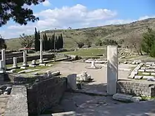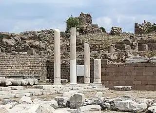 - Ciudad media, que ha conservado las murallas antiguas del tiempo de Átalo I. entre los edificios más notables estaban los gimnasios, construidos en 3 terrazas y el santuario de Deméter, mandado edificar por Filatero.