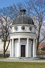 - En la arquitectura clásica europea, designa también a un modelo de edificio de más empaque, cercano a la rotonda o belvedere y que conserva del pabellón de tela, la única sala, la ligereza (ventanaje muy abierto) y el tejado en punta. Se incluye a menudo en una composición más extensa, que constituye un anexo prestigioso. : Por ej.: Pabellón de Breteuil.