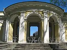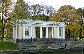 El pabellón, diseñado por Rossi en estilo neoclásico, fue construido para ofrecer un área de placer y refrigerio con vista al río, con un muelle donde amarrar los barcos. El pabellón sobrevivió al período soviético y fue parte de la restauración a gran escala del jardín a principios de la década de 2000. Como parte de esta obra, se colocó en el pabellón un busto del arquitecto Carlo Rossi.