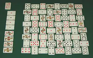 - Construcción de secuencias: la más común implica construir secuencias de naipes, generalmente por palo. Los naipes de una baraja mezclada se reparten en un diseño prescrito sobre una mesa. Luego, los naipes se mueven y colocan de manera que eventualmente se puedan organizar en una secuencia ascendente (por ejemplo, As de Rey) o descendente. Ocasionalmente, se apunta a ambas en el mismo juego. El naipe que inicia la secuencia requerida se conoce como naipe base o naipe fundacional y se dice que la secuencia o familia se construye sobre este naipe. En algunos casos, los naipes fundacionales se colocan en posición al principio; en otros, solo se colocan a medida que se obtienen durante el curso del juego. En algunos casos, los naipes de la secuencia deben ser del mismo palo que el naipe base; en otros, se ignora el palo. Algunos juegos permiten la creación temporal de secuencias auxiliares (ascendentes o descendentes), es decir, grupos de naipes en sucesión pero que aún no están listos para ser jugados en las familias o secuencias de las bases.