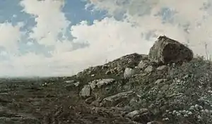 Representa un paisaje de Paestum (en la provincia de Salerno) con rocas y vegetación, arbustos y flores a la derecha y una pequeña explanada en la parte izquierda. Al fondo, el cielo se ve lleno de nubes.