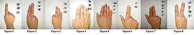 -Tercera posición: En la garganta, correspondiente a los fonemas /u/ e /i/. - Ocho figuras manuales que complementan las consonantes (Ver imagen superior, "Kinemas")