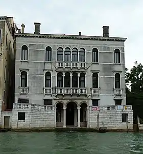 La fachada del palacio, realizada en el siglo XVII, está dividida en tres partes y destaca la presencia de dos cuerpos que sobresalen construidos en época posterior, realizados en piedra de Istria, cuyas paredes internas se curvan hacia el interior en dirección al portal al nivel del agua, dando lugar a una poco habitual terraza que mira al Gran Canal. En las plantas superiores, sin embargo, se encuentran dos políforas de cuatro aberturas y cuatro parejas de monóforas, típicas de las construcciones venecianas. En la fachada posterior destaca un gran portal de estilo barroco decorado con un gran escudo fechado en el siglo XVIII.[1]