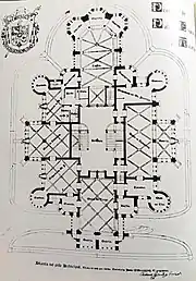 El palacio tiene planta de cruz griega, sobre la que se superpone una planta cuadrada, con cuatro torres cilíndricas en las esquinas, y rodeado por un foso.[12] En las torres se encuentra el escudo del obispo Grau, con la leyenda Pax Christi in cordibus vestris y la letra griega tau, por Tarragona.[9] En dos de los laterales presenta unos cuerpos sobresalientes de planta rectangular, mientras que en los otros dos se encuentran la torre de entrada y la capilla: la primera es de base cuadrada y cuenta con un porche de acceso al palacio; la segunda es también rectangular y está rematada con un ábside y tres absidiolos.[21]