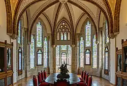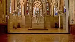 Además de otras dos habitaciones, cierra el conjunto de la planta noble la capilla, que es una estancia sin columnas con acceso en forma de dos arcos apuntados; en la paredes hay frescos de Fernando de Villodas, con diversos temas bíblicos (Presentación de Jesús en el templo, Adán y Eva, David, Salomón, Jesús entre los doctores, Abraham e Isaac, El nacimiento de Jesús y diversas inscripciones latinas); el altar es de mármol blanco con una imagen de la Virgen de la Azucena; las capillitas situadas en el ábside albergan cuatro estatuas de santos españoles (san Isidoro, santo Toribio, san Genadio y san Ildefonso), obra de Enrique Marín Higuero.[36] Las vidrieras del ábside contienen escenas de las vidas de Jesús y María así como la Creación de Adán y Eva, la Expulsión de Adán y Eva del Paraíso y la Coronación de la Virgen por el Dios Padre, obra de J. H. Maumejean.[37] Sobre la entrada de la capilla hay dos balcones a modo de coro decorados con mosaicos de tonos azules y con unas inscripciones que señalan el comienzo y finalización de las obras del templo: en la izquierda, «INCHOATVM XXIV JVNII MDCCCLXXXIX EPISCOPO GRAV ARCHITECTO GAVDI»; en la derecha, «PERFECTVM XII OCTOBRIS MDCDXIII EPISCOPO ALCOLEA ARCHITECTO GVERETA».[38]