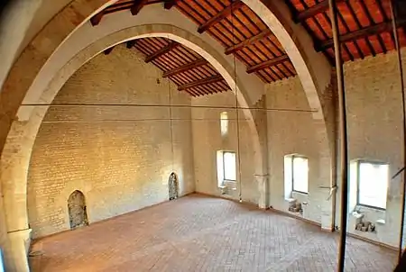 - Duro en este sentido es el juicio de G. Fontana y A. Spalvieri, Op.cit.,p. 10: "Questa serie di interventi, assolutamente scevri da qualsiasi interesse filologico, ha sconvolto interamente lo spazio interno del corpo di fabbrica ed ha fornito al tetto una conformazione non rispondente a nessun canone storico e stilistico, addirittura evidenziando nella falda esposta ad ovest un quadrilatero di massicce cordonature in cemento. (Esta serie de intervenciones, absolutamente carentes de cualquier interés filológico, ha conmocionado a todo el espacio interior del edificio y dio al techo una estructura que no se ajusta a ningun canon histórico y estilístico y al oeste muestra también un anillo de grandes bordillos de hormigón.)"
