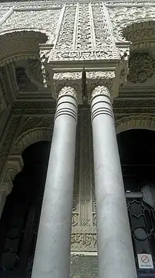 - En la fachada podemos reconocer el arco de herradura estilo califal cordobés que se encuentran en el primer nivel, acompañados de dos arcos polilobulados en sus costados (uno a cada lado del arco central) y en el segundo nivel se encuentra un arco mixtilíneo como principal y dos arco conopial que es similar al del orden del primer nivel. Las columnas del primer y segundo nivel son compuestas. En el segundo nivel hay un corredor.